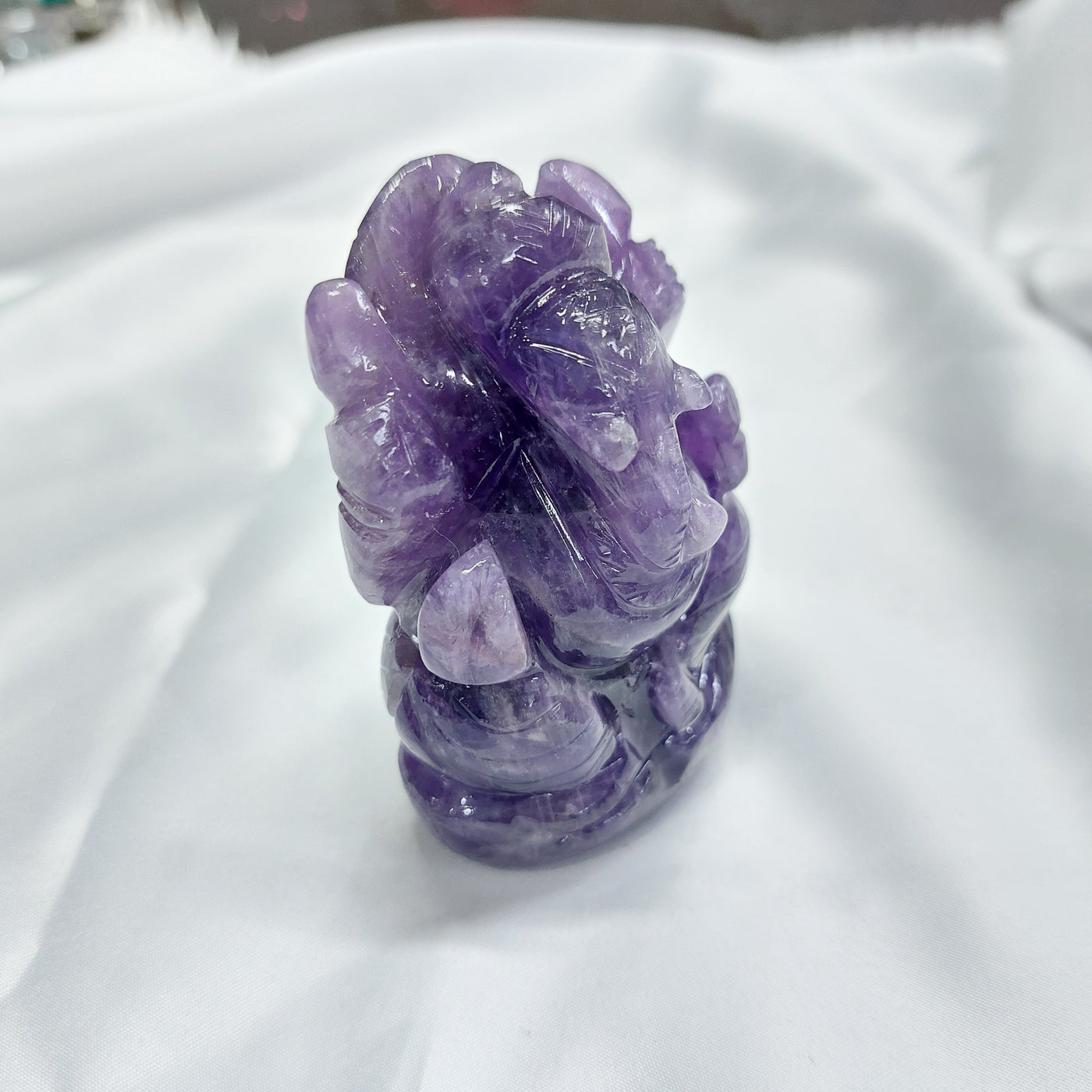 Amethyst Ganesha is a hand-carved statue of Lord Ganesha crafted from natural Amethyst crystal. It combines the divine presence of Ganesha—known as the remover of obstacles and god of wisdom, peace, and prosperity—with the calming and spiritual properties of Amethyst. This crystal promotes inner peace, intuition, emotional balance, and spiritual awareness while protecting against negative energy. Perfect for home altars, meditation corners, or sacred spaces, each idol is unique, polished, and spiritually uplifting.
