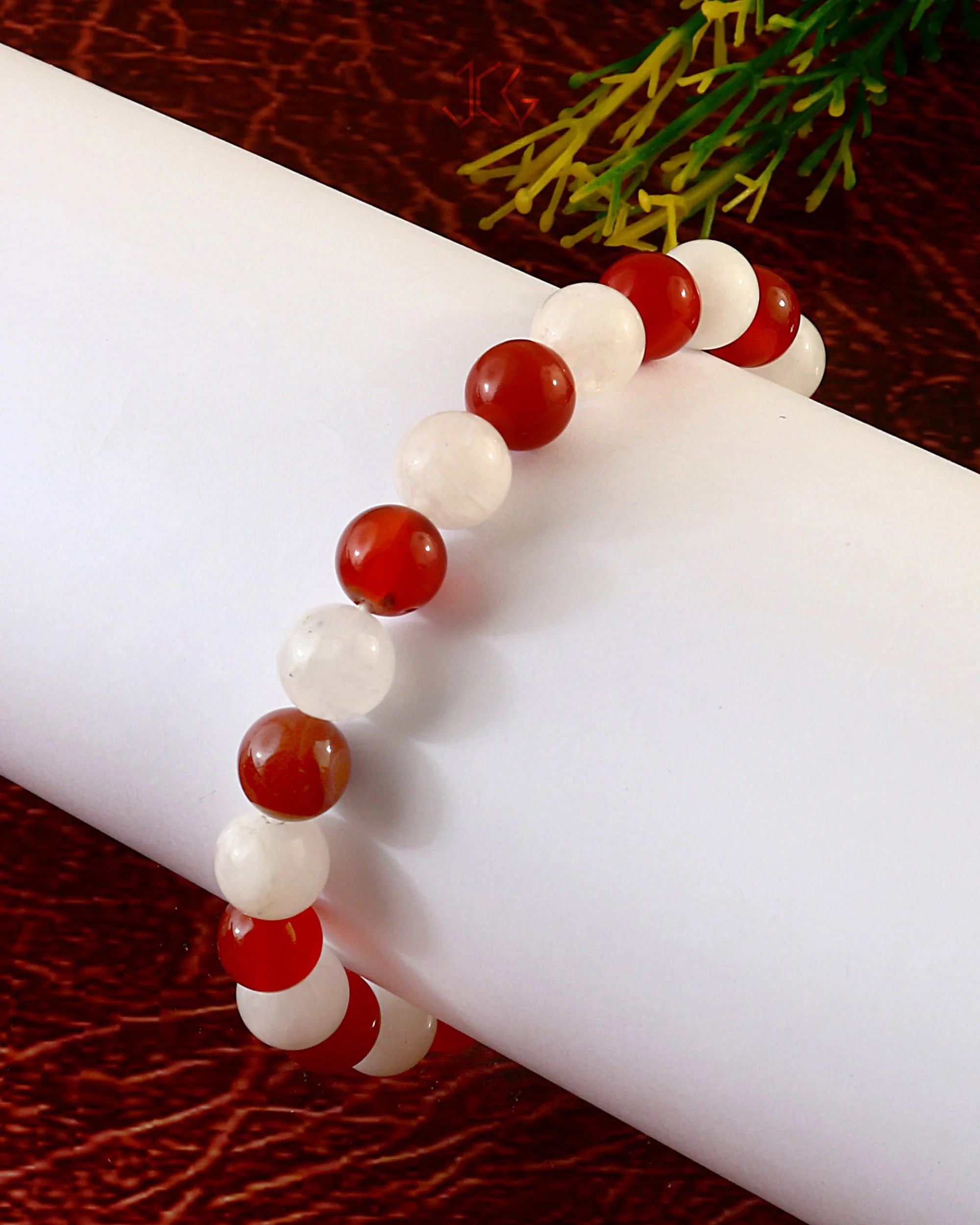 - Material: 8mm Carnelian and Moonstone beads strung on an elastic cord.