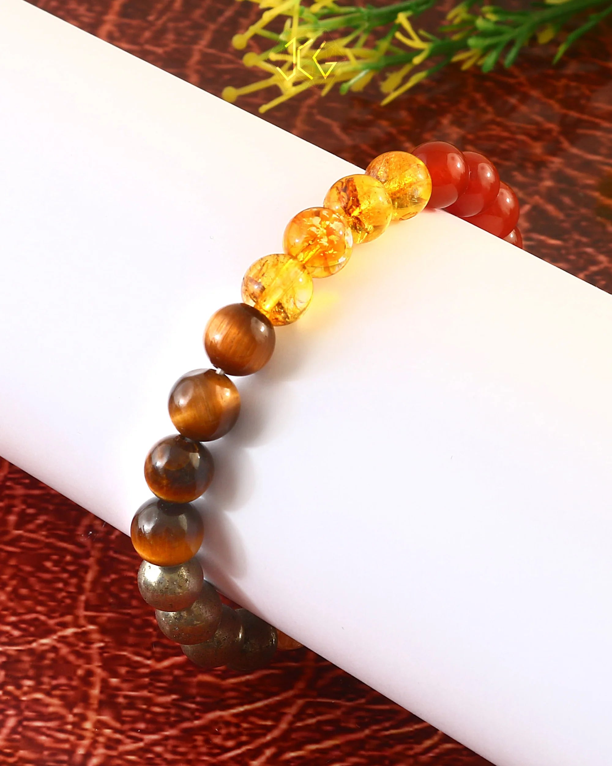 - Material: 8mm Bronzite, Carnelian, Citrine, Tiger Eye, Pyrite, and Sunstone beads strung on an elastic cord.