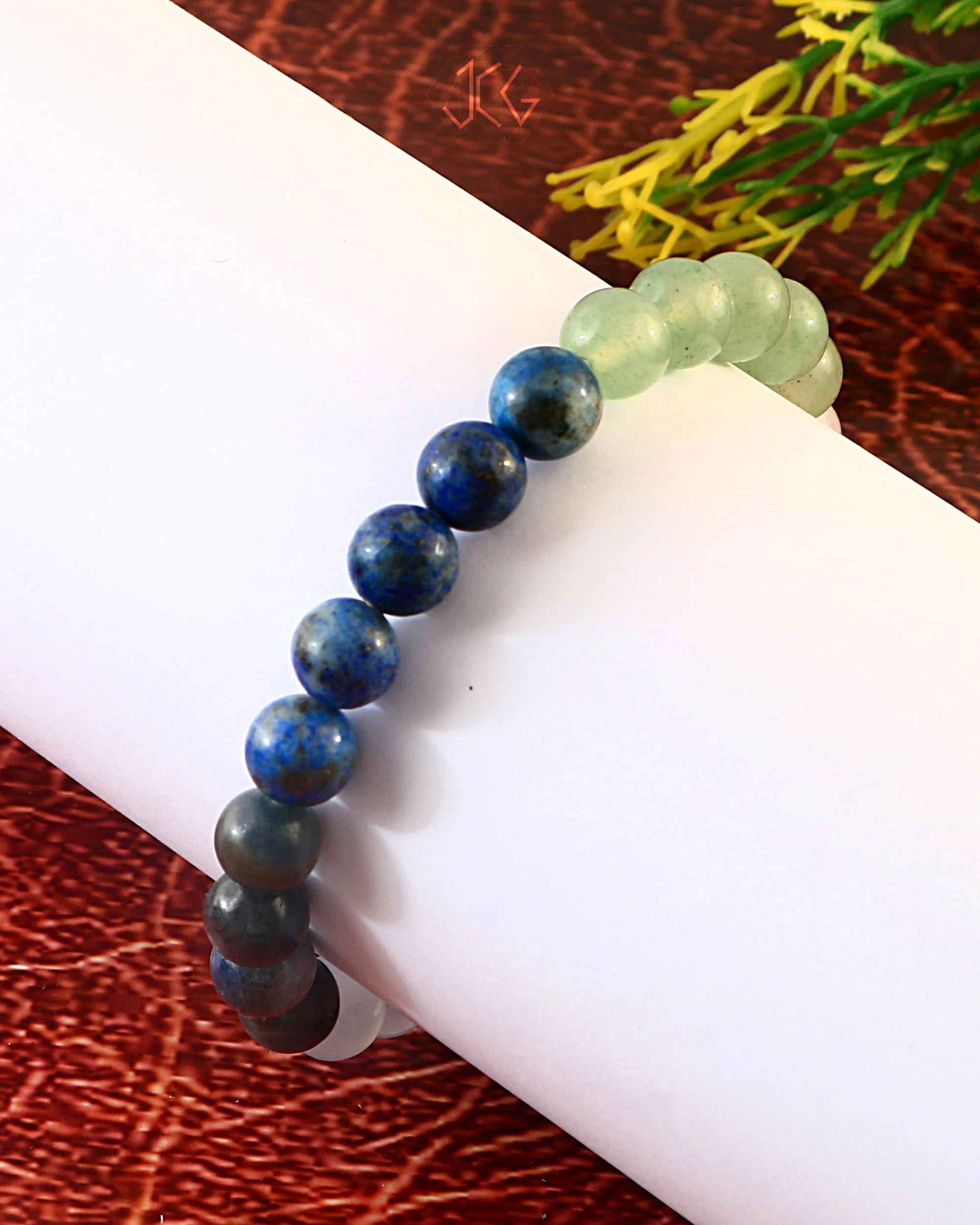 - Material: 8mm Rose Quartz, Lapis Lazuli, Blue Lace Agate, and Royal Blue Sapphire beads strung on an elastic cord.