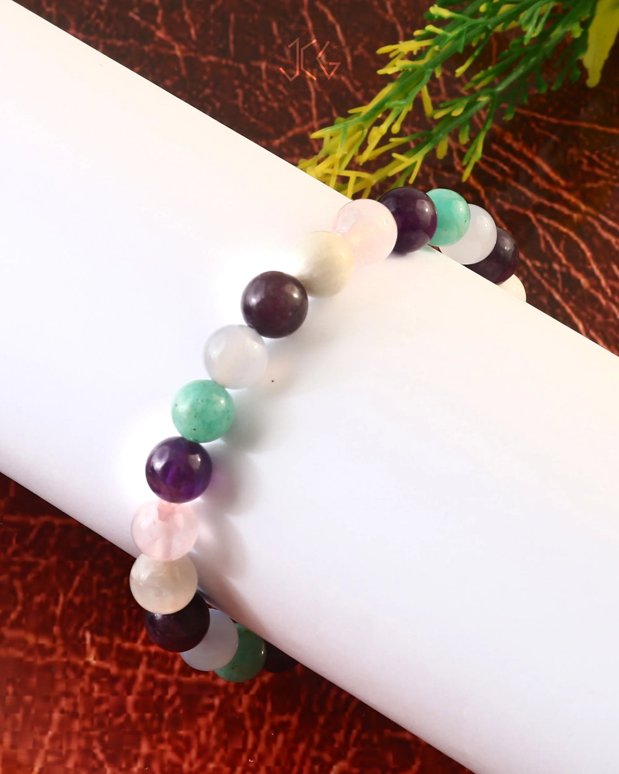 - Material: 8mm Lepidolite, Amazonite, Amethyst, Rose Quartz, Blue Lace Agate, and Rainbow Moonstone beads strung on an elastic cord.