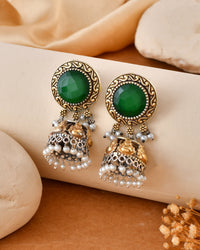 Add an ethnic touch to your festive look with these stunning Regal Green Stone Dandiya Jhumka Earrings from Jaipur Crystal Gems. Crafted in high-quality white metal, these earrings feature a vibrant green stone centerpiece, beautifully surrounded by intricate engraved detailing. The hanging jhumki is adorned with dual-tone gold accents and delicate pearl beads, making it perfect for Garba, Navratri, and all traditional occasions. Lightweight, durable, and anti-tarnish, these earrings celebrate both tradition and elegance. Ideal for pairing with ethnic dresses and lehengas, this statement piece is a must-have for your festive collection.