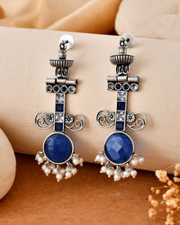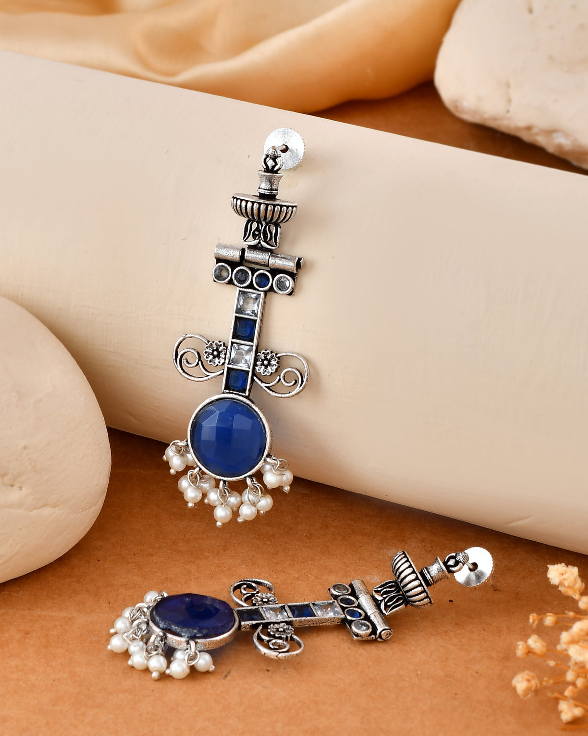 Add a royal touch to your festive look with our Neelam Raas Dandiya White Metal Earrings. Crafted in high-quality white metal, these earrings feature a bold blue stone centerpiece, enhanced with square stone detailing and delicate floral accents. The hanging pearl drops add graceful movement, making them perfect for twirling during dandiya and garba nights.