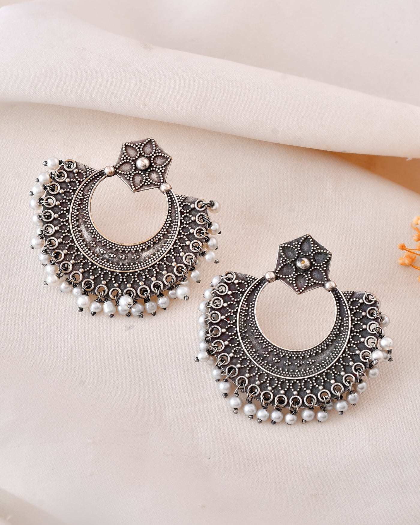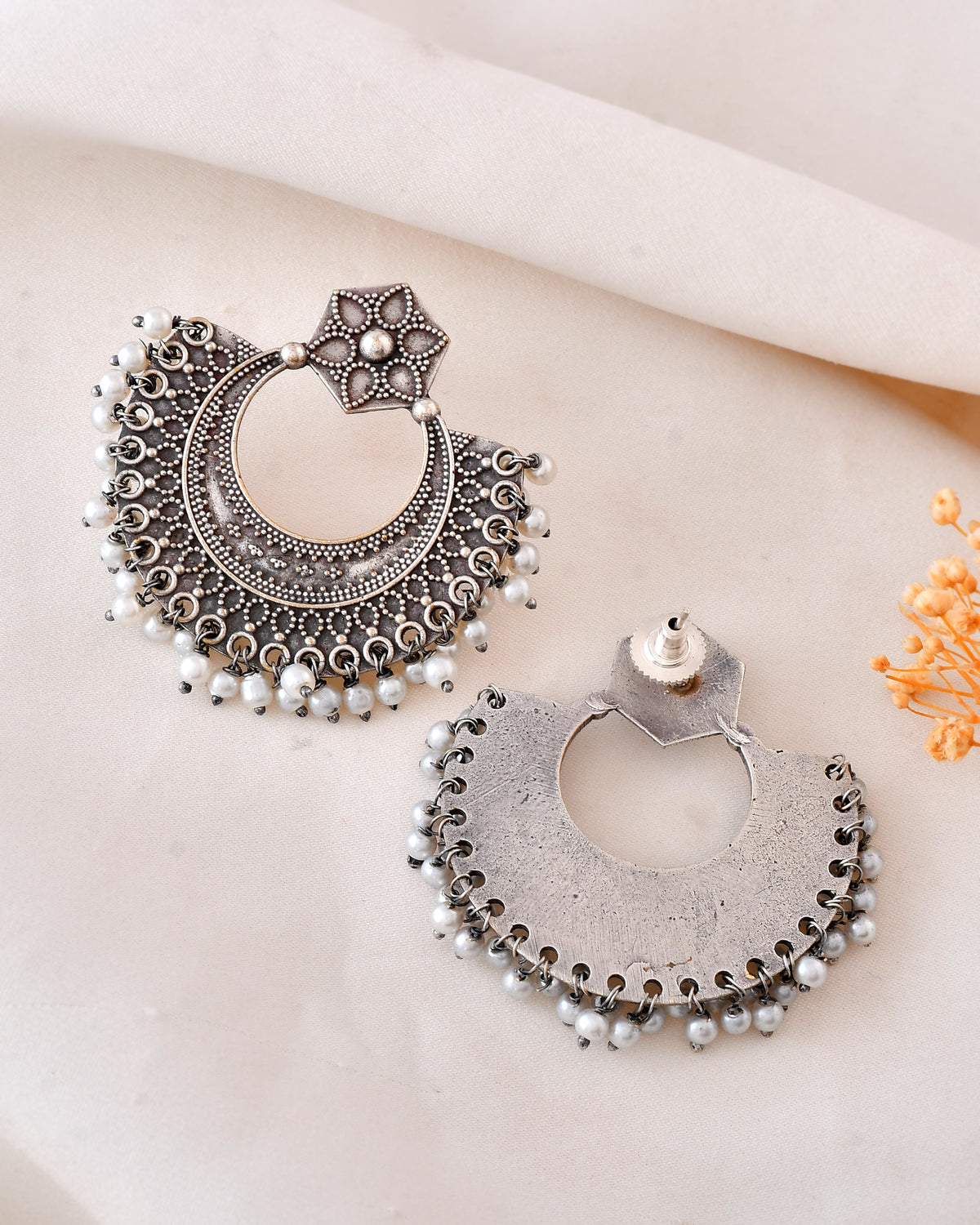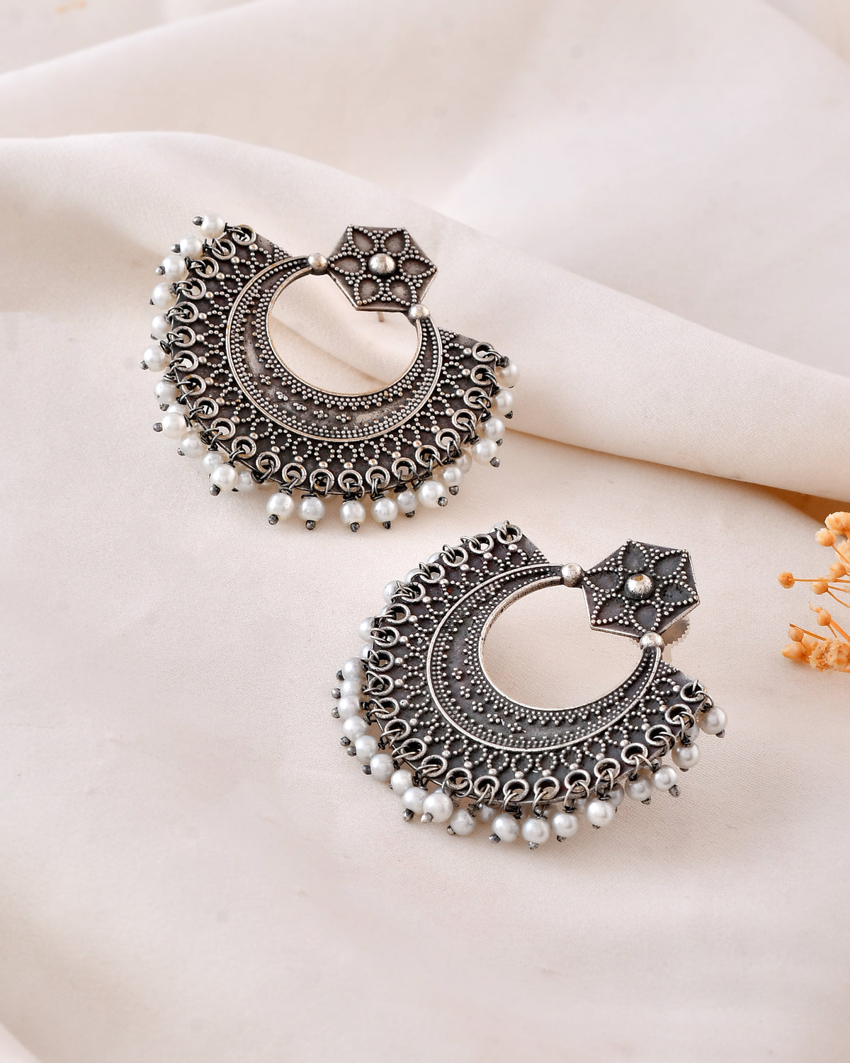 Make every celebration memorable with the Pearl Crescent Dandiya Hoop Earrings from Jaipur Crystal Gems. Meticulously handcrafted in high-quality white metal, these grand crescent hoops feature intricate filigree detailing, elegant beadwork, and a graceful arrangement of pearl drops along the edge. The oxidized finish adds a classic vintage look, while the pearls bring a touch of sophistication, making them perfect for Dandiya nights, weddings, and all traditional occasions. Comfortable to wear and visually striking, these earrings are ideal for those who want to embrace heritage style and modern flair in one exquisite accessory.