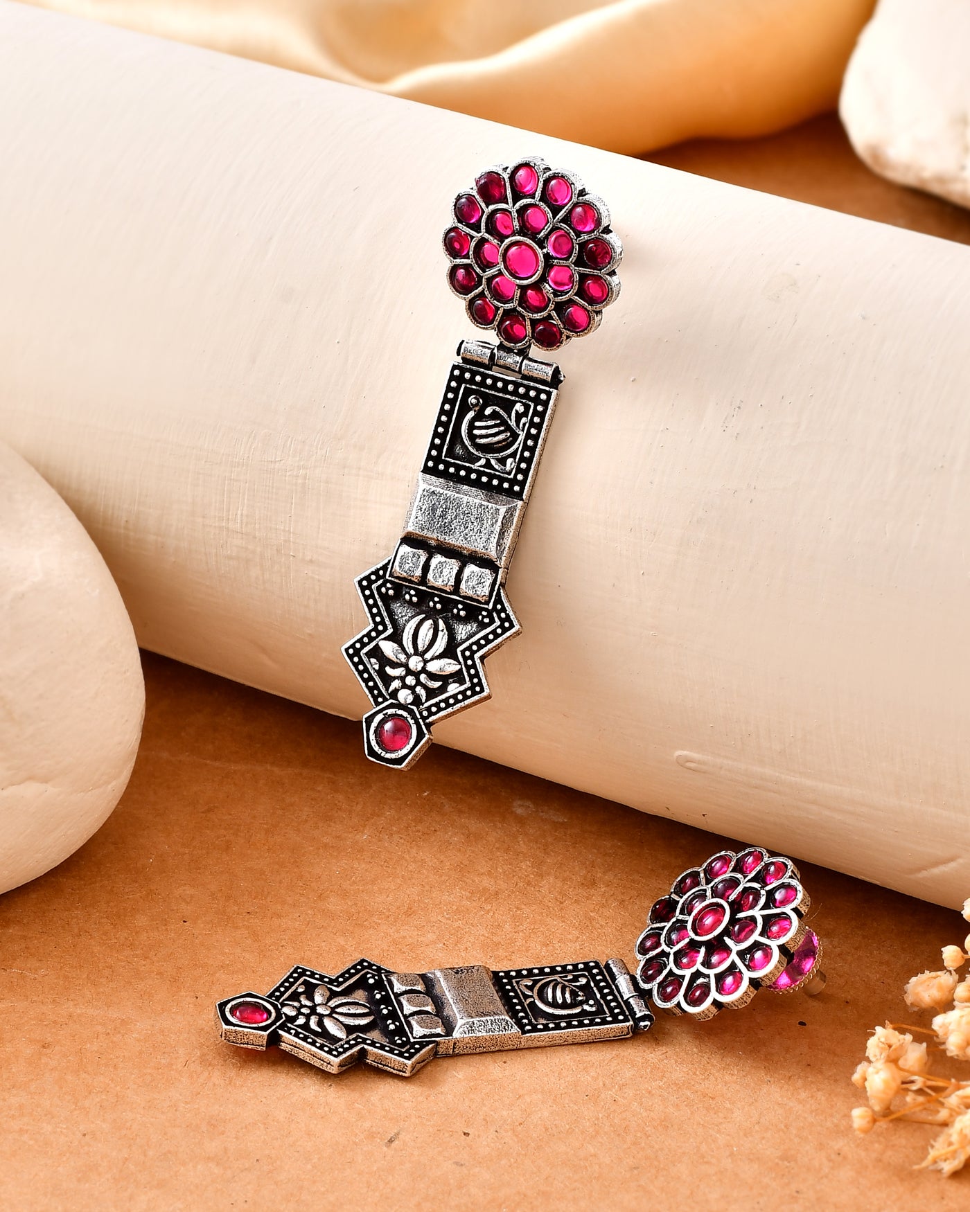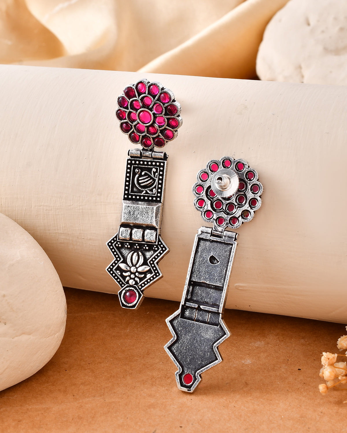 Celebrate the spirit of dance and tradition with our Rangilo Dandiya White Metal Earrings. Handcrafted in durable white metal, these earrings feature a stunning floral stud embedded with vibrant pink stones, flowing into intricate traditional motifs that capture the essence of festive charm. Designed especially for dandiya and garba nights, they perfectly complement colorful ethnic outfits while adding a touch of Rajasthani elegance.