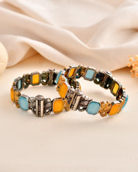 Brighten up every festive occasion with the Fiesta Glow Dandiya Bangles from Jaipur Crystal Gems. Carefully handcrafted from premium white metal, each bangle is adorned with alternating blue and yellow gemstone inlays and exquisite golden filigree work, symbolizing vibrancy and elegance. These bangles capture the joyful essence of traditional Dandiya jewellery, combining comfort with timeless beauty. Their lively colors and intricate design make them an ideal accessory for Garba nights, weddings, or any cultural event where tradition meets celebration. Add a splash of color and a touch of heritage to every festive look with these stunning statement bangles.