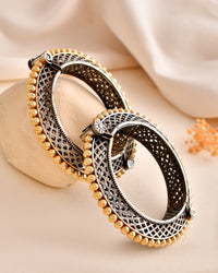 Celebrate timeless artistry with the Golden Lattice Dandiya Bangles from Jaipur Crystal Gems. These statement bangles are meticulously handcrafted using superior white metal and adorned with intricately designed latticework, crowned with a row of shimmering gold beads along the edge. The bold geometric patterns blend seamlessly with antique silver and gold tones, capturing the essence of Rajasthani tradition and festive flair. Perfect for Dandiya nights, Garba celebrations, or as an enchanting addition to ethnic outfits, these bangles offer both comfort and enduring style. Express heritage and elegance at every festivity with this stunning jewellery piece.