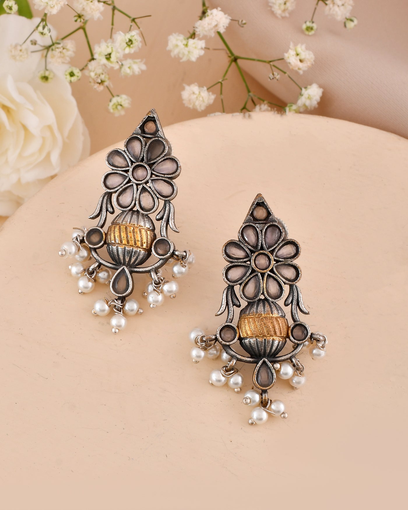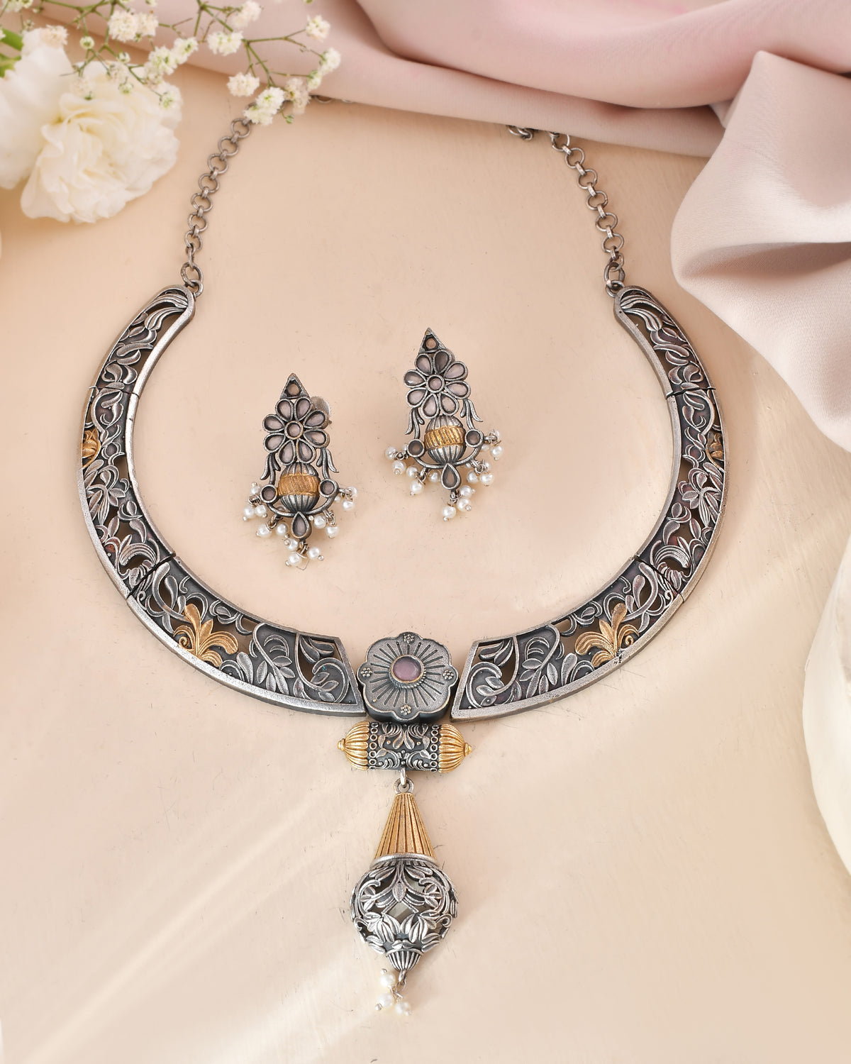 Radiate traditional elegance with the Kesar Pushp Dandiya Necklace Set, masterfully crafted in white metal and finished with antique oxidized detailing. This artistic choker set features intricate floral engravings along the necklace, highlighted with subtle golden accents and a blooming flower motif at the center for a regal festive touch.