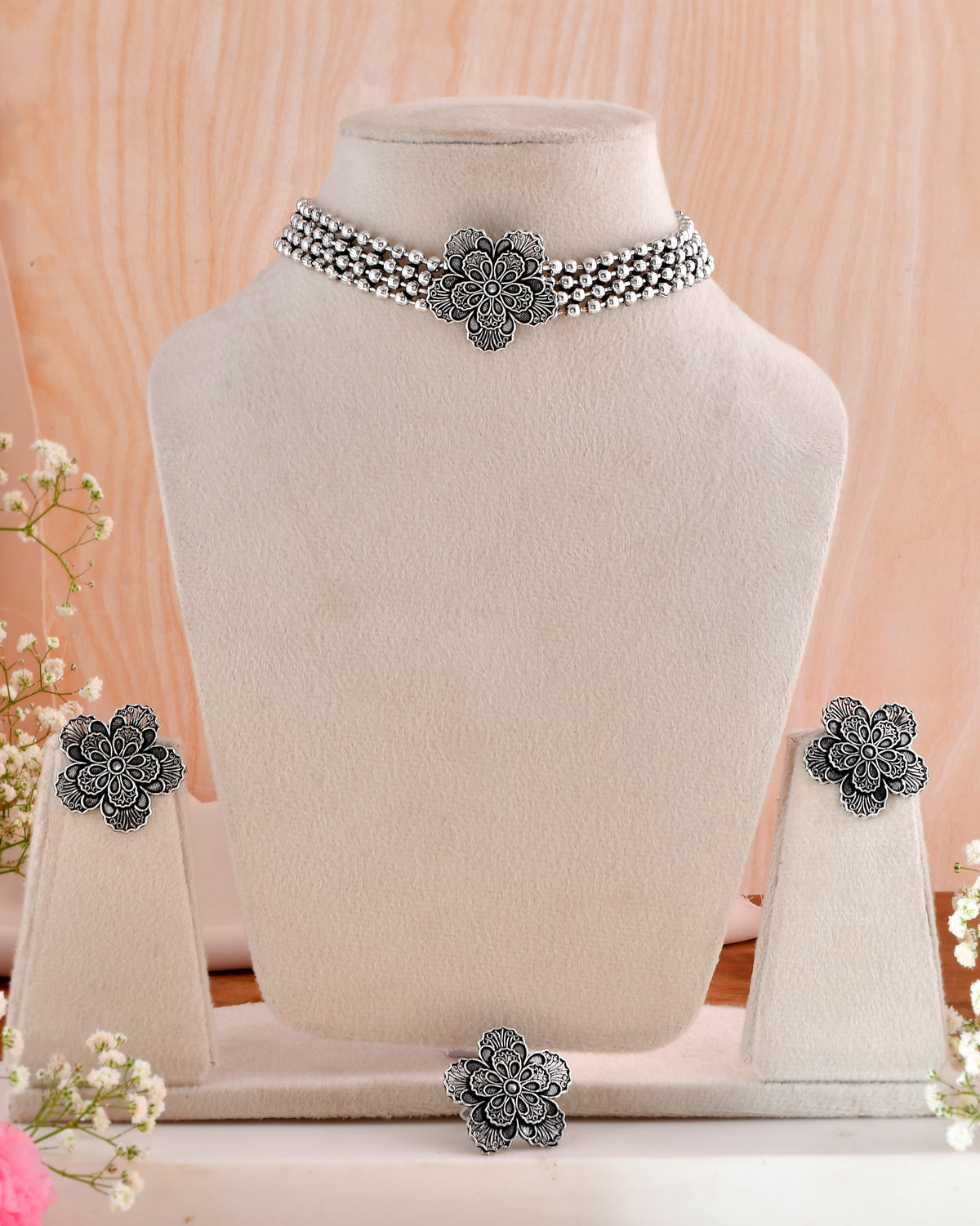 Celebrate the spirit of festivity with the Pushpa Pallavi Floral Necklace Set, expertly handcrafted from white metal and adorned with bold, intricate five-petal floral motifs. This statement set features a choker necklace, matching earrings, and an adjustable ring, all capturing the timeless allure of traditional floral jewelry—ideal for Dandiya, Navratri, and joyful celebrations.