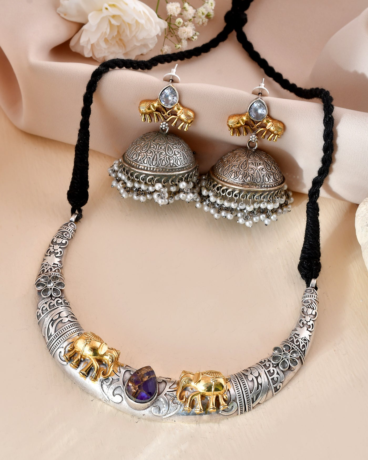 Embrace festive royalty with the Rajhasti Dandiya Necklace Set, artistically crafted in premium white metal and adorned with exquisite elephant motifs. The necklace features intricately engraved golden elephants on both sides of a vibrant gemstone centerpiece, heightening the elegance and symbolism of strength, wisdom, and good fortune. Paired with grand jhumka earrings embellished with miniature elephants, traditional patterns, and delicate pearl clusters, this set is a true celebration of Indian heritage.
