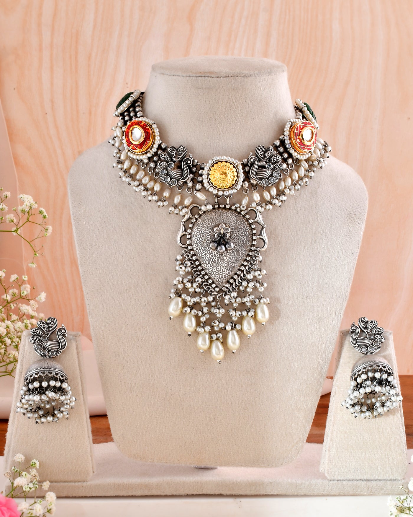 Elevate festive elegance with the Rajsi Kundan Pearl Dandiya Choker Set from Jaipur Crystal Gems—a designer piece blending heritage white metal, radiant Kundan highlights, and lustrous pearls for a regal Garba or Dandiya look. This statement choker features intricate oxidised motifs, miniature deity and floral accents, rich multi-color Kundan detailing, and grand heart-shaped pendant, all framed by luxurious pearl strings and droplets.