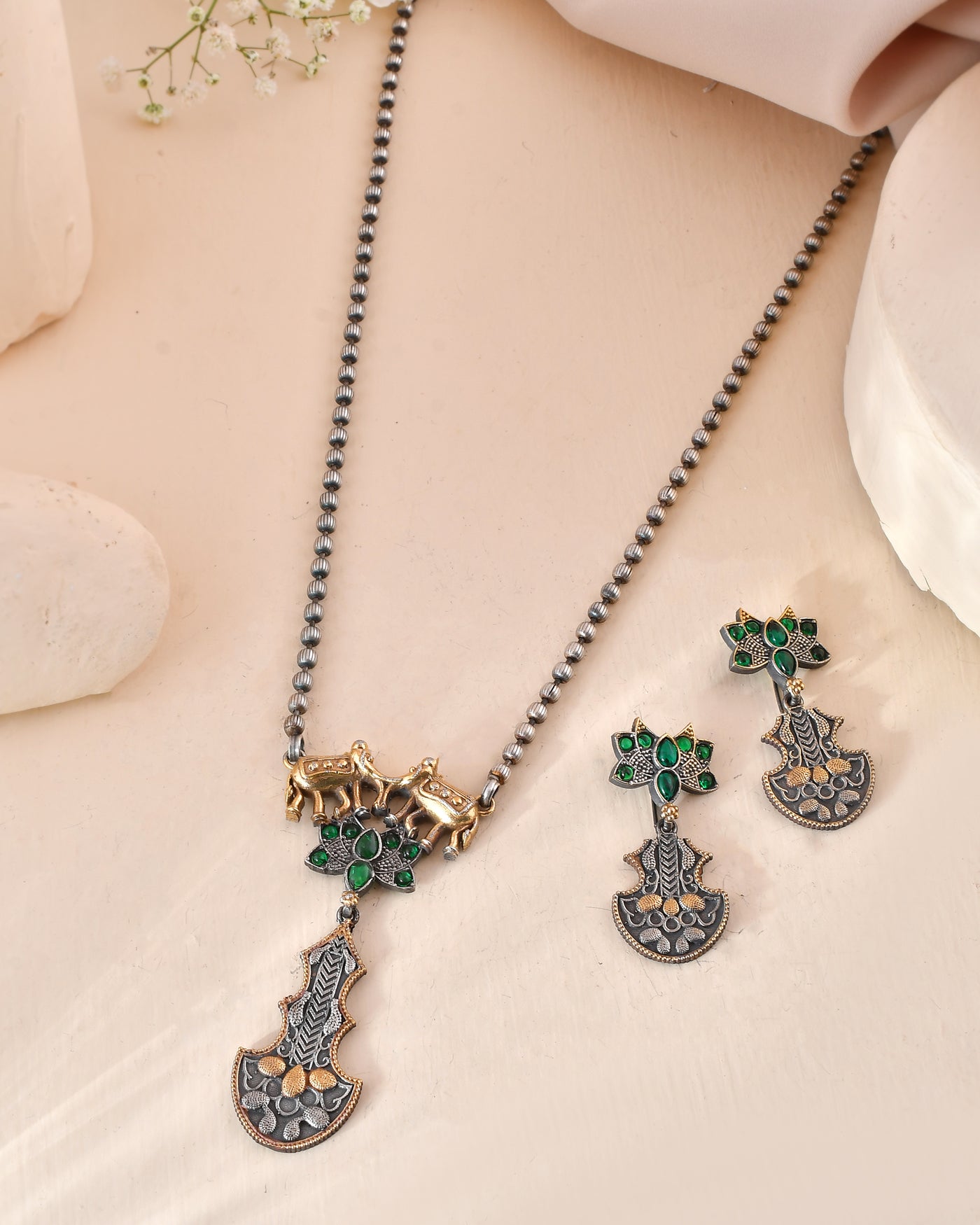 Celebrate tradition with the Sacred Cow Dandiya Necklace Set, thoughtfully crafted in premium white metal for a classic festive appeal. This elegant set highlights two golden cow motifs at the center, a symbol of prosperity and spiritual significance in Indian culture, paired with a delicately engraved oxidized pendant and green accent stones.