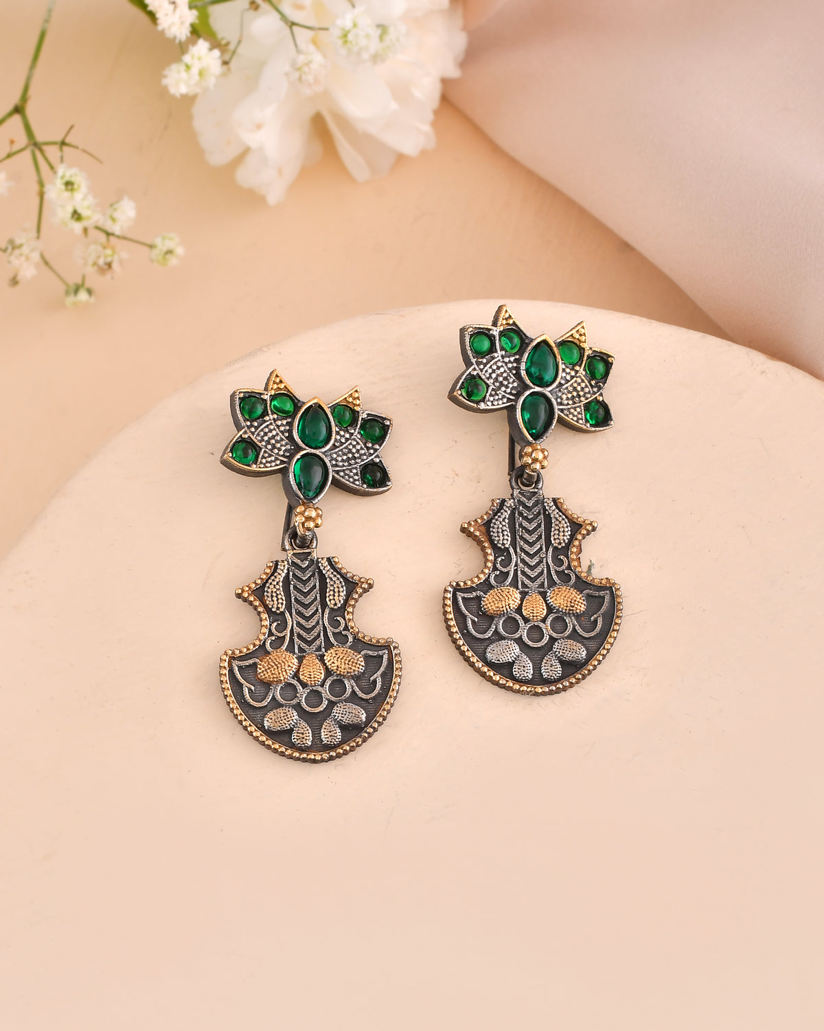 Matching earrings echo the intricate design, featuring rich green stones and traditional shapes that perfectly capture the vibrant spirit of Navratri and Garba nights. Lightweight and versatile, this set is ideal for ethnic ensembles and festive celebrations, ensuring a charming and graceful look