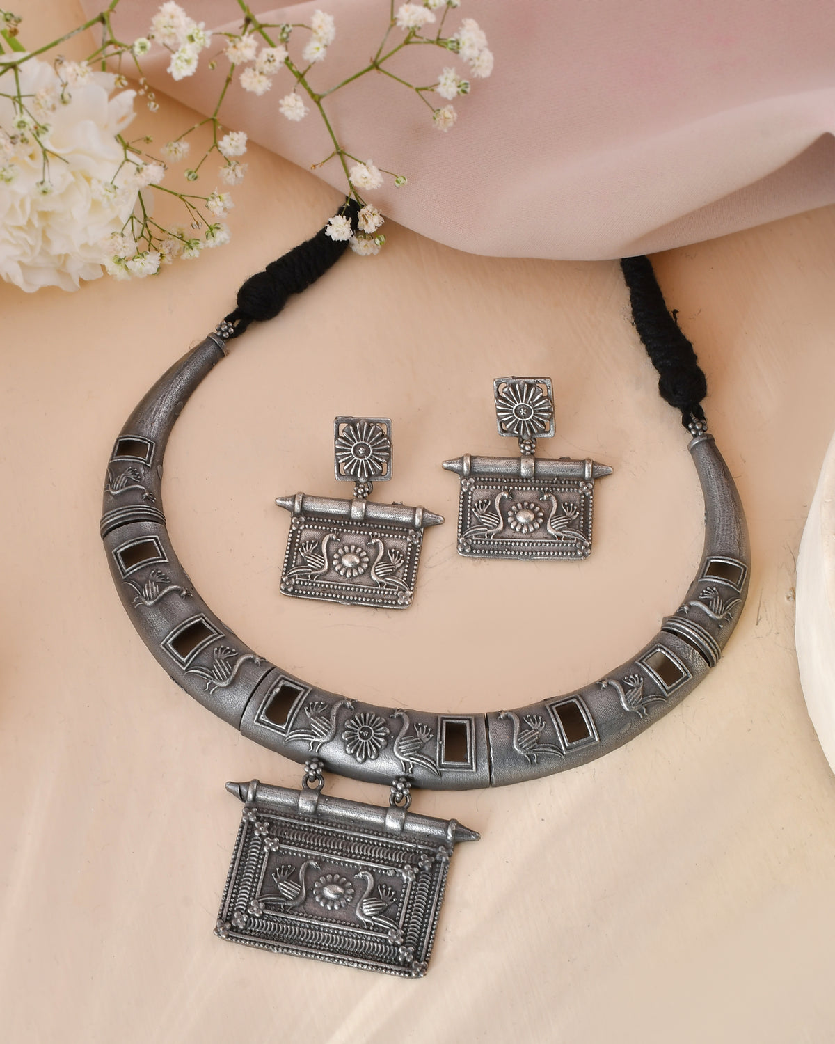 Step into the festivities with the Tribal Charm Dandiya Necklace Set, thoughtfully handcrafted from high-quality white metal for an authentic traditional appeal. This oxidized set features striking ethnic motifs and a bold rectangular pendant, bringing rustic elegance and cultural depth to your Navratri and Dandiya look.