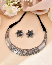 Showcase bold elegance with the Tribal Viraasat Torque Necklace Set, meticulously handcrafted from white metal and inspired by traditional tribal artistry. This distinctive crescent-shaped torque necklace features intricate floral engravings and comes with statement star-motif swirl earrings—perfect for making an impact during Navratri, Dandiya, and festive gatherings.