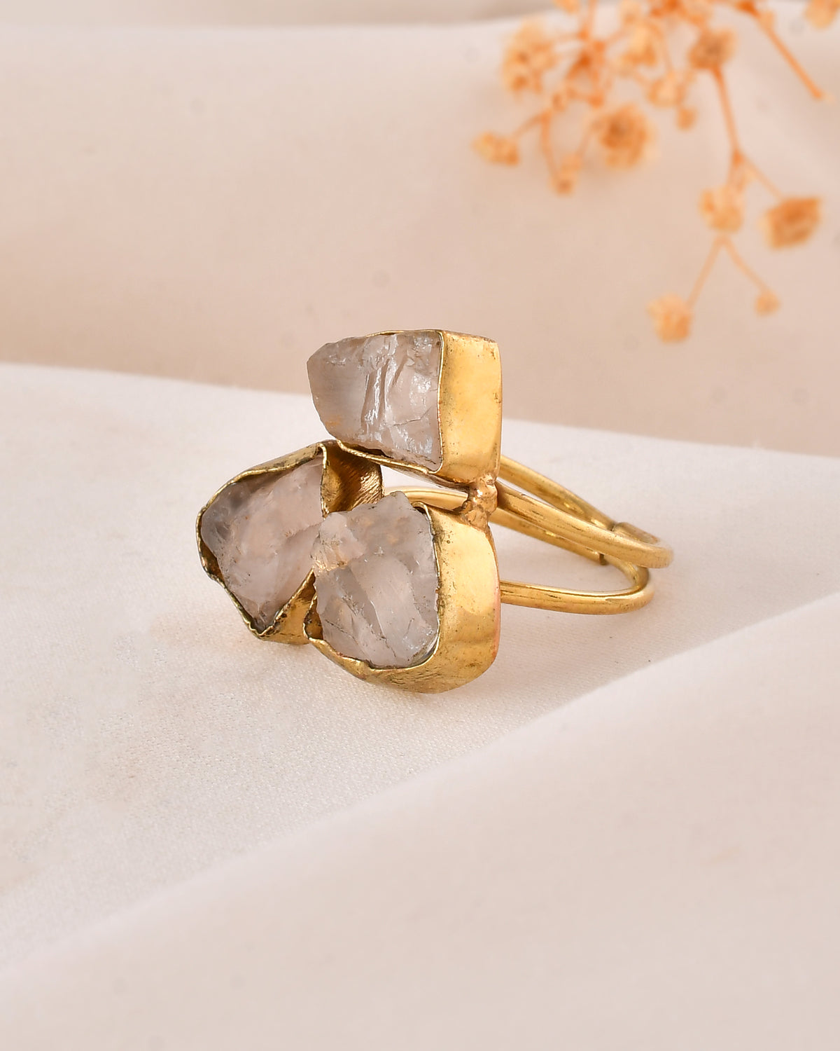Enhance your festive ensemble with the Blush Quartz Dandiya Statement Ring from Jaipur Crystal Gems. Meticulously handcrafted in premium white metal and finished with radiant golden plating, this striking ring features three rough-cut rose quartz stones that symbolize love and serenity. The adjustable design ensures a perfect fit, while the soft blush tones and organic texture add a truly artisan touch. Ideal for those who appreciate unique, nature-inspired jewellery, this ring is the perfect accessory for Dandiya nights, traditional weddings, or any day you want to showcase timeless grace and modern style together.