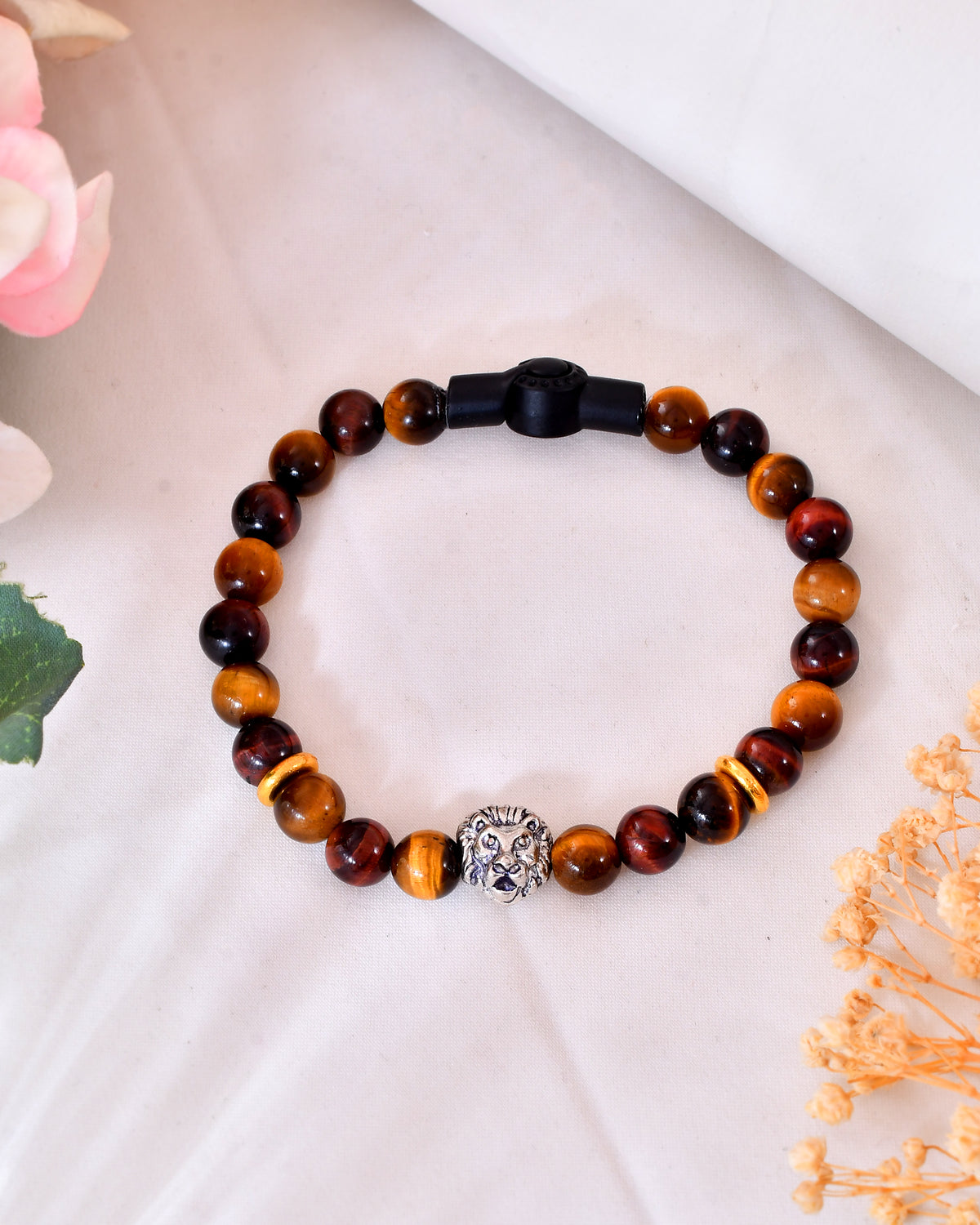 Royal Courage Tiger Eye Lion Bracelet With Black Magnet Lock - Without Certificate / 6 inch