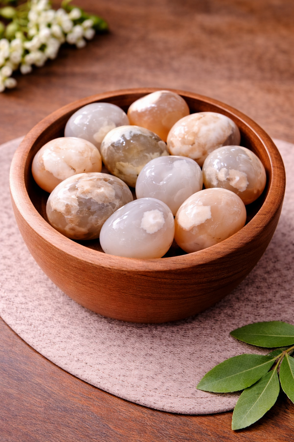 Flower Agate is widely used for meditation, manifestation work, desk décor, crystal bowls, and as a comforting pocket stone. Its soft energy makes it ideal for those starting new journeys or working toward long-term goals.