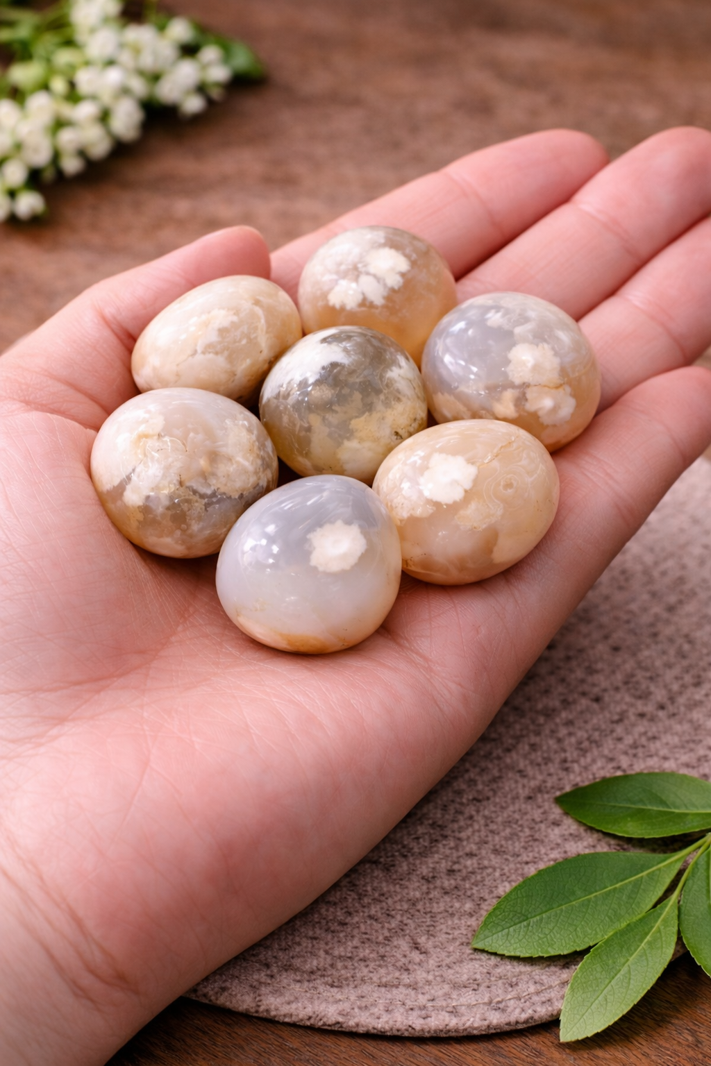 Flower Agate is a beautiful natural crystal known for its soft milky tones blended with peach, cream, and translucent hues, featuring unique flower-like inclusions that resemble blooming petals inside the stone. These natural patterns make every Flower Agate tumble completely unique and visually soothing.