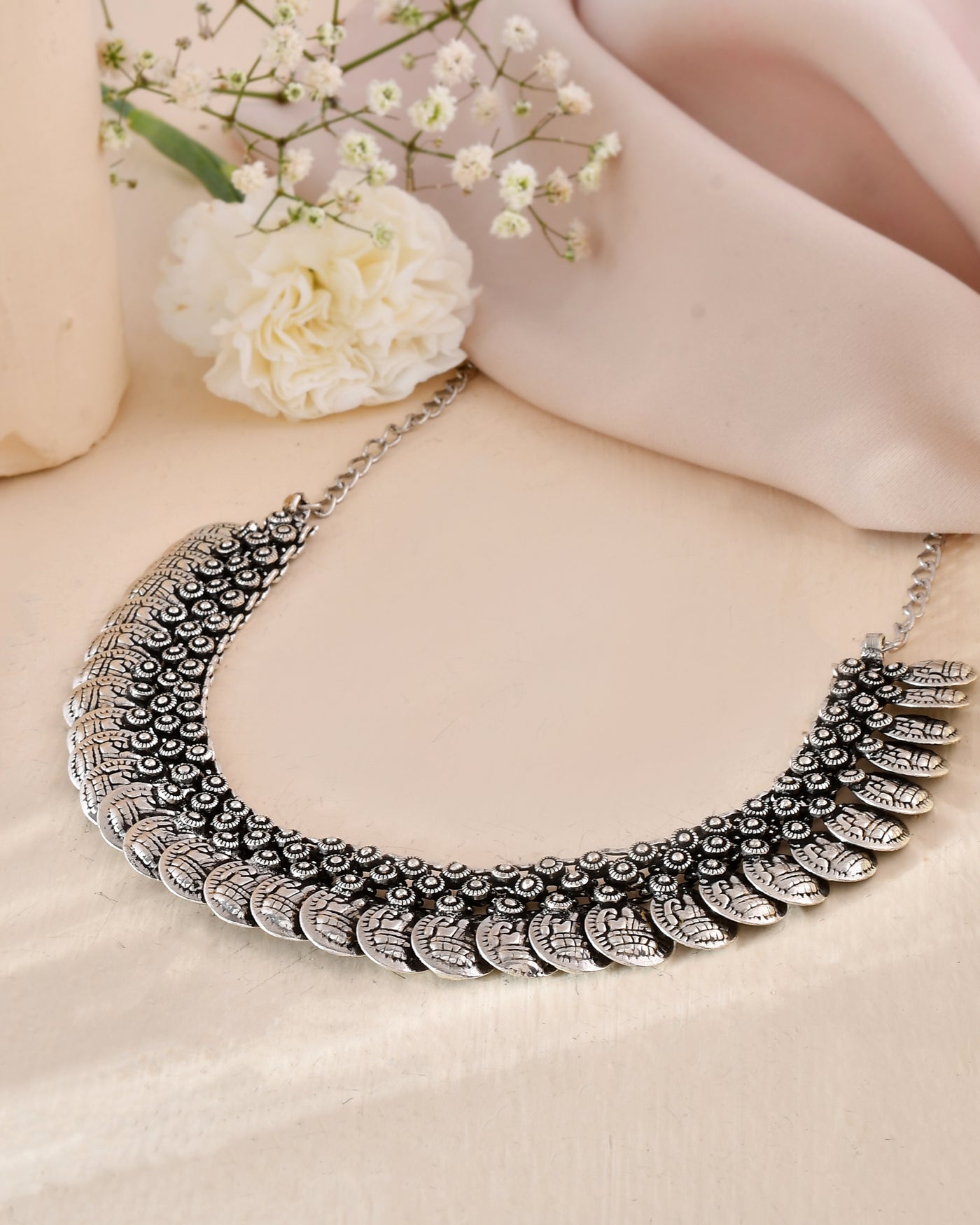 Make a captivating festive statement with the Boho Coin Charm Dandiya Necklace from Jaipur Crystal Gems—an elegant fusion of tradition and contemporary style for Garba and Dandiya celebrations. Meticulously handcrafted in premium white metal, this necklace features rows of ornate coin charms with intricate detailing and oxidised finish, radiating ethnic Rajasthani flair and bohemian spirit.