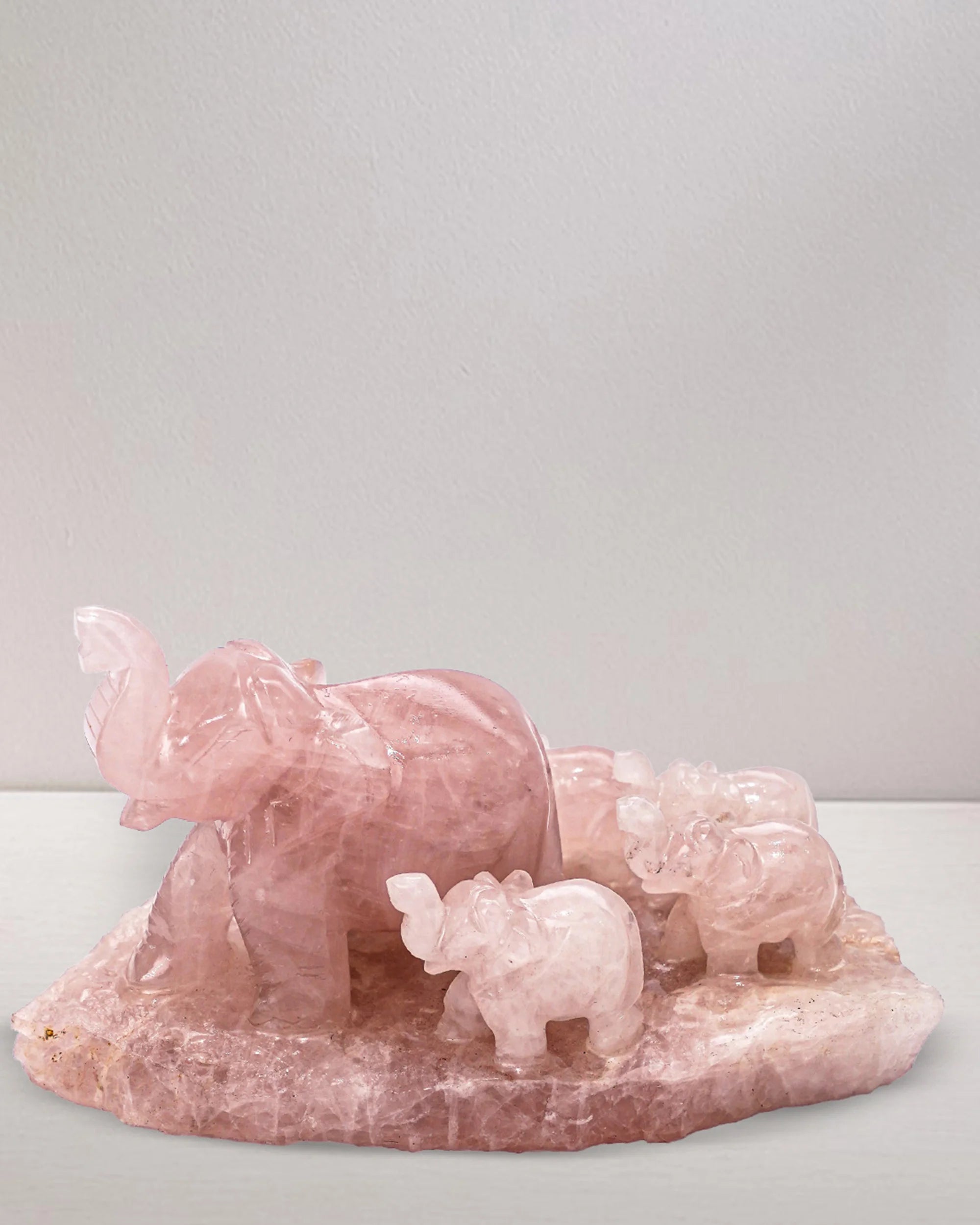 Material: Natural Rose Quartz stone, carved into an elegant elephant family.